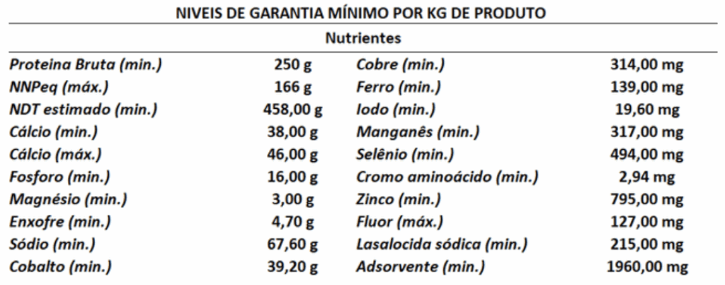 Produto pronto uso, formulado com melhorador de desempenho, amiréia, destinado à suplementação mineral e proteica dos bovinos de corte nas fases de cria, recria e engorda a campo, por todo ano.