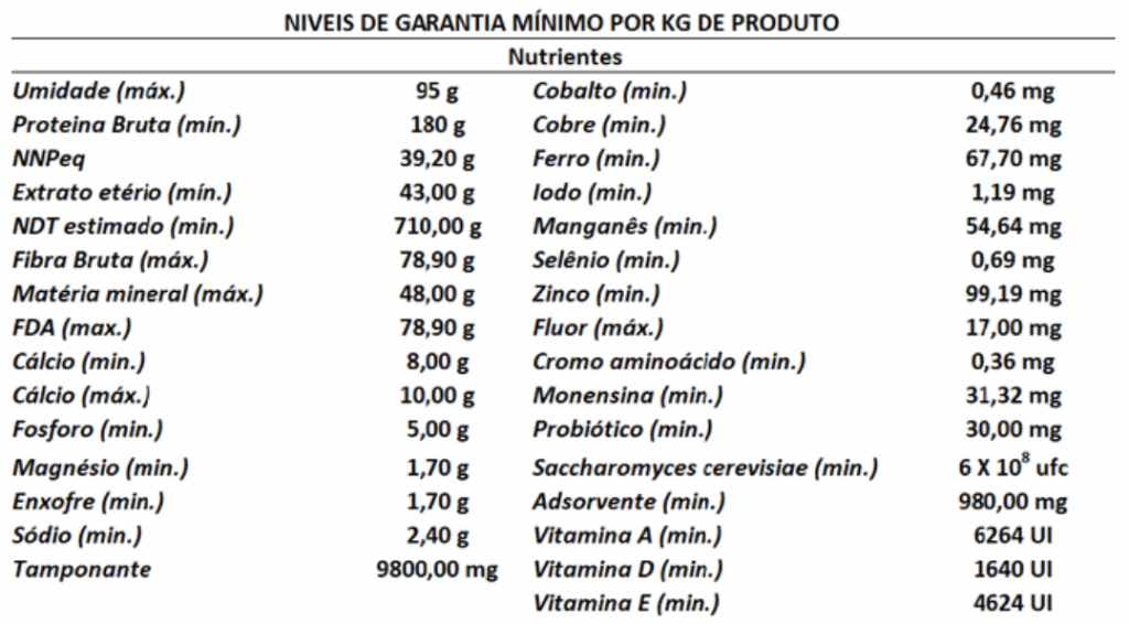fornecer 1 kg de ração para cada 2,5 litros de leite produzidos por vaca dia ou de acordo com a orientação do responsável. Produto contém amiréia, sendo necessário fase de adaptação.