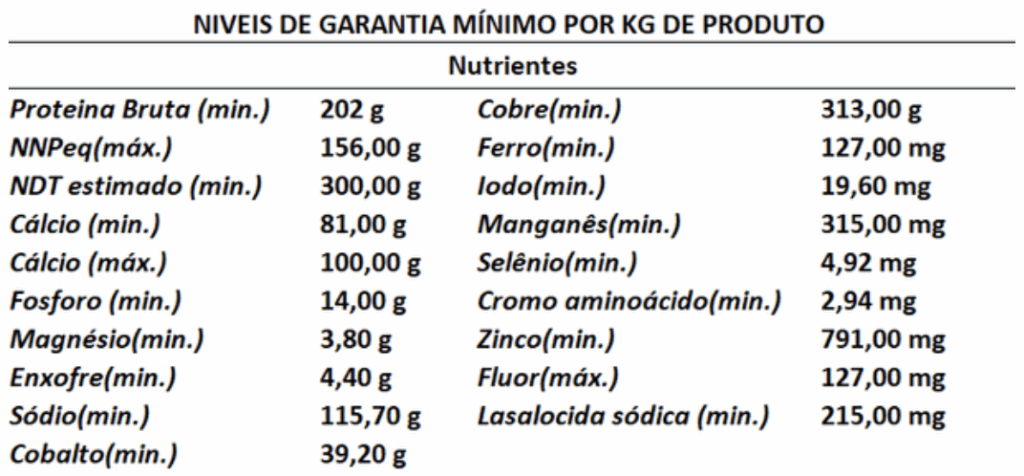 Produto pronto uso, formulado com melhorador de desempenho, amiréia, destinado à suplementação mineral e proteica dos bovinos de corte nas fases de cria, recria e engorda a campo, por todo ano.