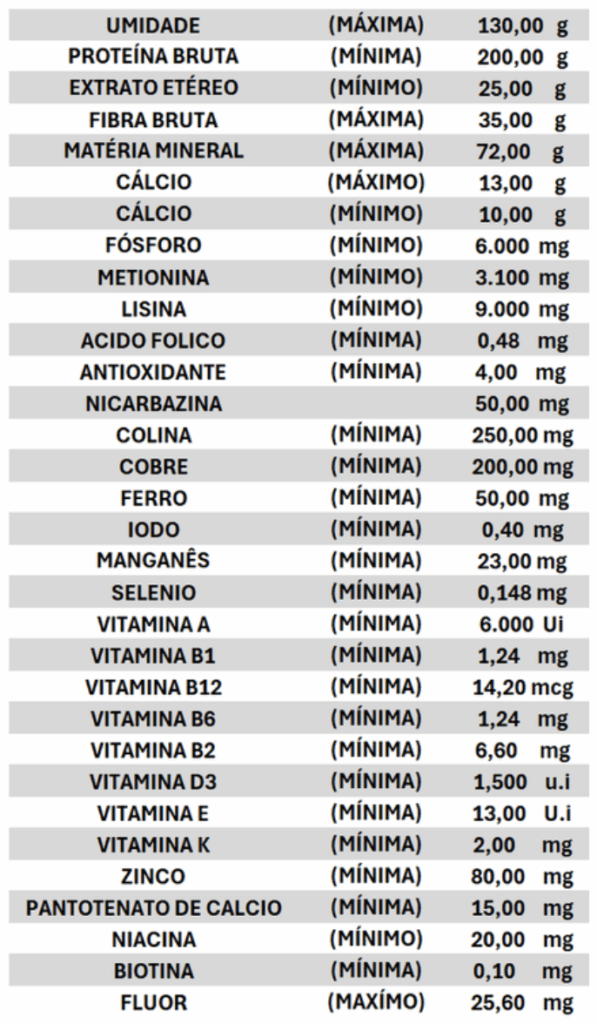 Níveis de garantia por quilograma do produto